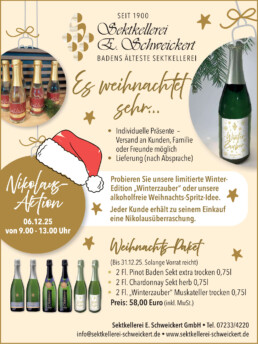 Tauchen Sie ein in die festliche Welt der Sektkellerei E. Schweickert, Badens ältester Sektkellerei. Unsere Nikolaus-Aktion vom 06.12.25 bietet Ihnen von 9:00 bis 13:00 Uhr die perfekte Gelegenheit, unsere Produkte zu probieren und eine Nikolausüberraschung zu erhalten. Entdecken Sie auch unsere limitierte Winter-Edition „Winterzauber“ – ein prickelndes Erlebnis für die kalte Jahreszeit – oder unsere beliebte alkoholfreie Weihnachtsspritz-Idee.